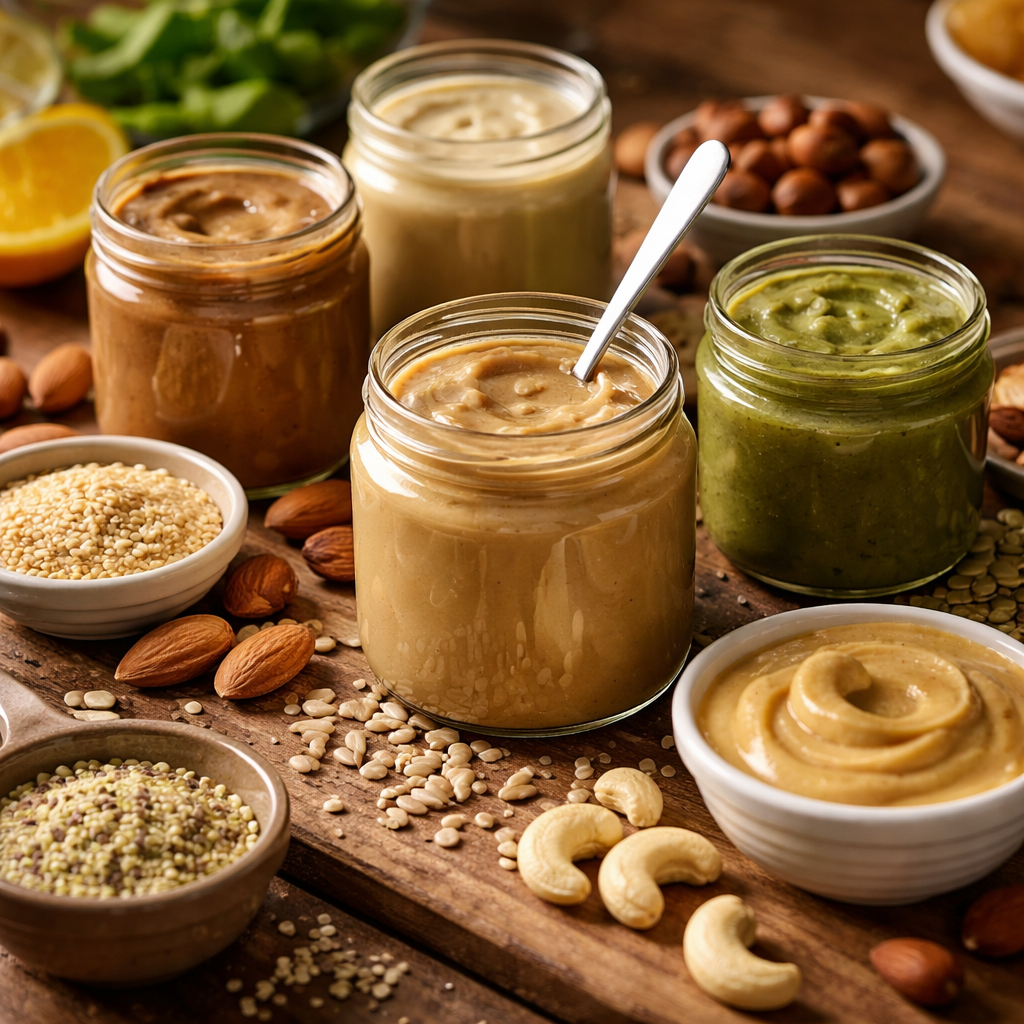 - Pumpkin seed butter — deep, nutty flavor with a naturally green tint; high in magnesium and zinc