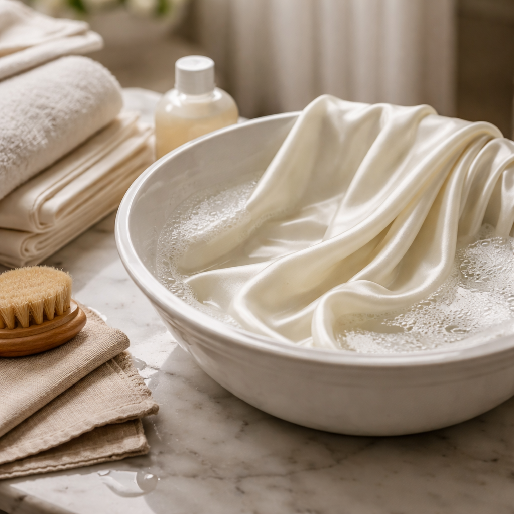 - Fill a clean basin with cool or lukewarm water — never hot. Temperatures above 30°C can cause silk to shrink or lose its luster.