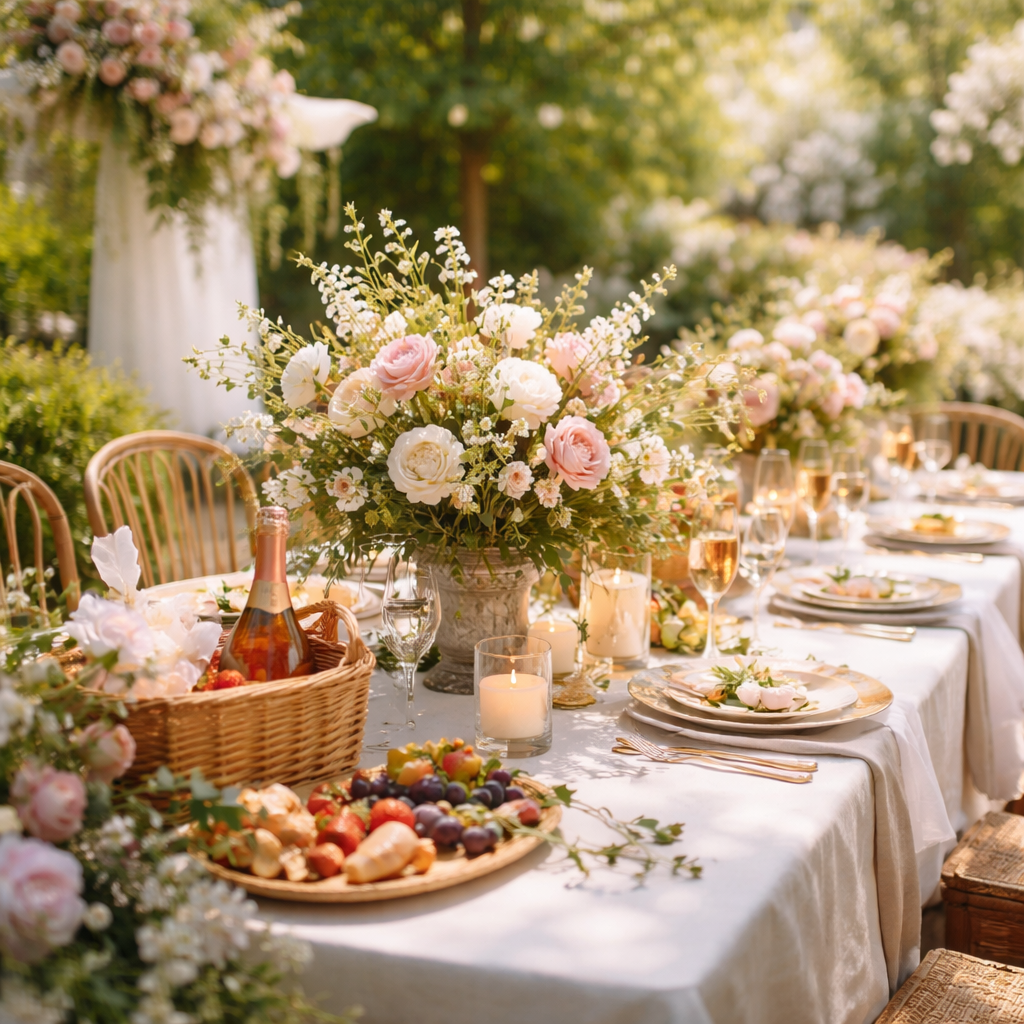 This theme works beautifully outdoors or indoors with the right greenery. Think wildflower centerpieces, linen tablecloths, mismatched vintage teacups, and a grazing table with seasonal produce. The color palette tends toward soft greens, dusty roses, and ivory — elegant without being stiff. This setting naturally encourages relaxed conversation, which is exactly what a bridal shower should feel like.